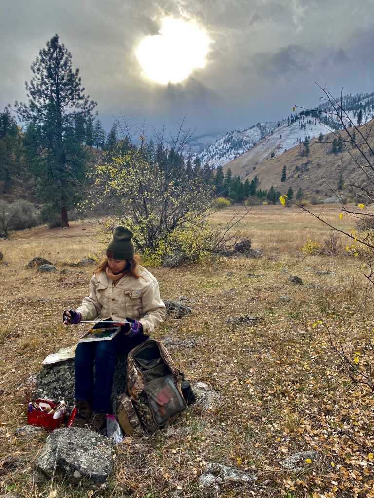 A friend and artist, Andy White, rekindled my passion by inviting me to a Pleinaire competition in Driggs Idaho. My husband, Mike, encouraged me to try acrylics. With all my children raised and a sold business, this is a beautiful and rewarding time in my life. Beauty, brewskies and the backwoods, that’s where you will find me, nature has become my most beloved art teacher.